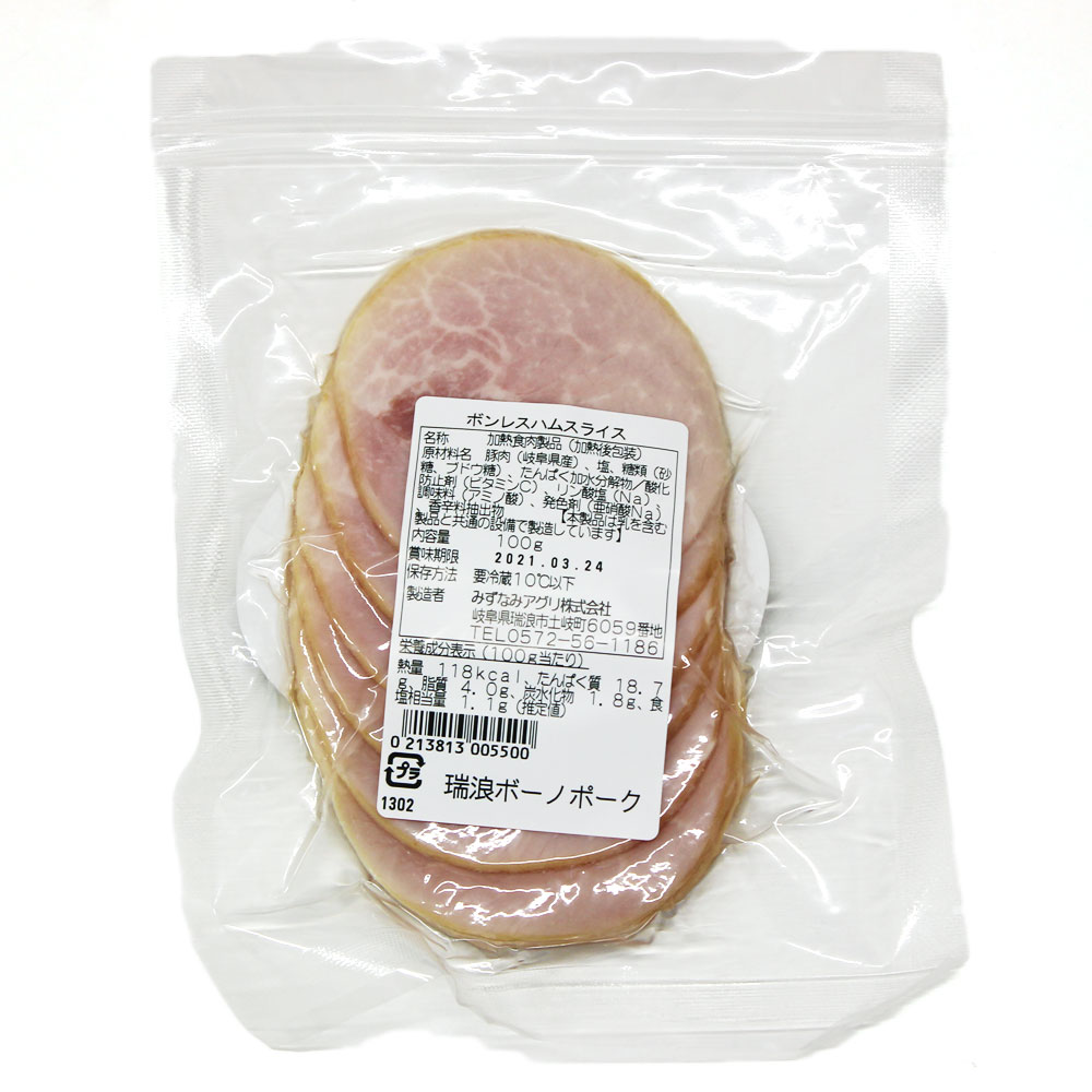 「ボンレスハム」塩漬けにした瑞浪ボーノポークのモモ塊肉をケーシングに詰めて、燻煙、加熱した脂身の少ないハム。