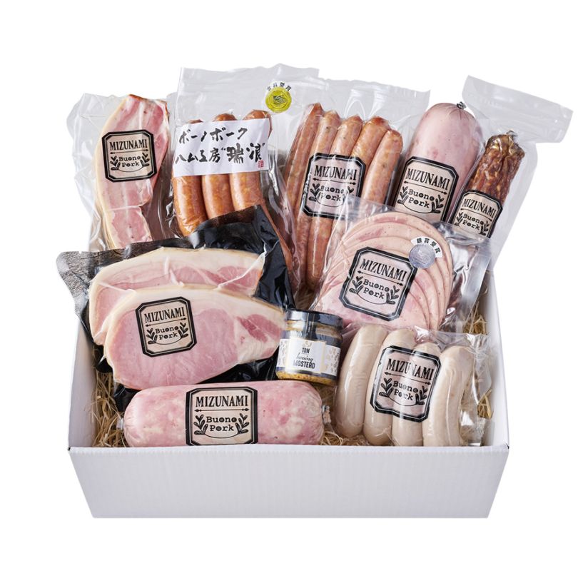 ロースハムステーキ250g、ベーコン厚切り 200g、プレスハム 300g、極あら【太】280g、チューリンガー 120g、極あらソーセージ 150g、ブラックペッパーソーセージ 150g、ビアシンケンスライス 100g、サラミソーセージ、マスタード 45g、白化粧箱